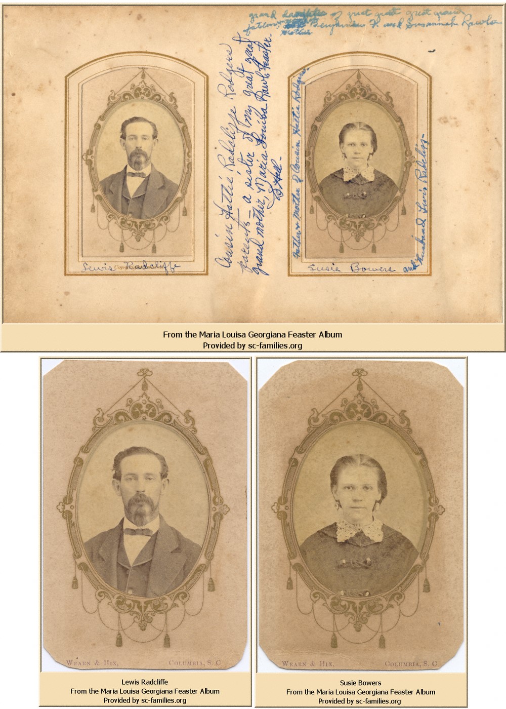 This "Carte de Visite" album was originally given to Maria Louisa Georgiana Feaster by a beau, Charlie Radcliffe, just before he left for service in the Civil War. Lula added her own photographs to the album and made minor notations to identify them. As the album passed from hand to hand, family members added photographs of Lula's relatives and descendents. Marginal notes by various family members, most notably Cleora "Cle" Clowney Hall, provided additional information about each individual and allowed us to locate them within the family tree. Notes on the back of many photos gave clues to the relationships among these individuals, and often revealed their fate. Without these notes, it would have been very difficult to identify many of these people.