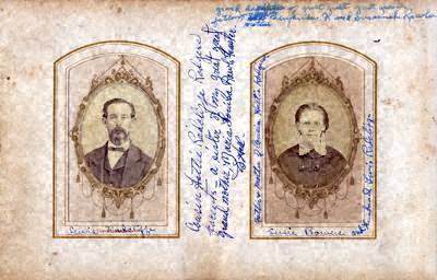 I am in the process of placing copies of all the pages from the Feaster album online. Each image will show a view of the album page at the top with copies of the individual Carte de Visite placed below. If the card had printing or notes on the reverse side those images will be included. It will take me a while to get all the images online so please be patient. When sharing the images please keep them intact (no cropping) so the full information is retained. Please look at our copyright page for the terms of use. Click the links below to view, or right click to save. Lewis Radcliffe and Susie Bowers. |